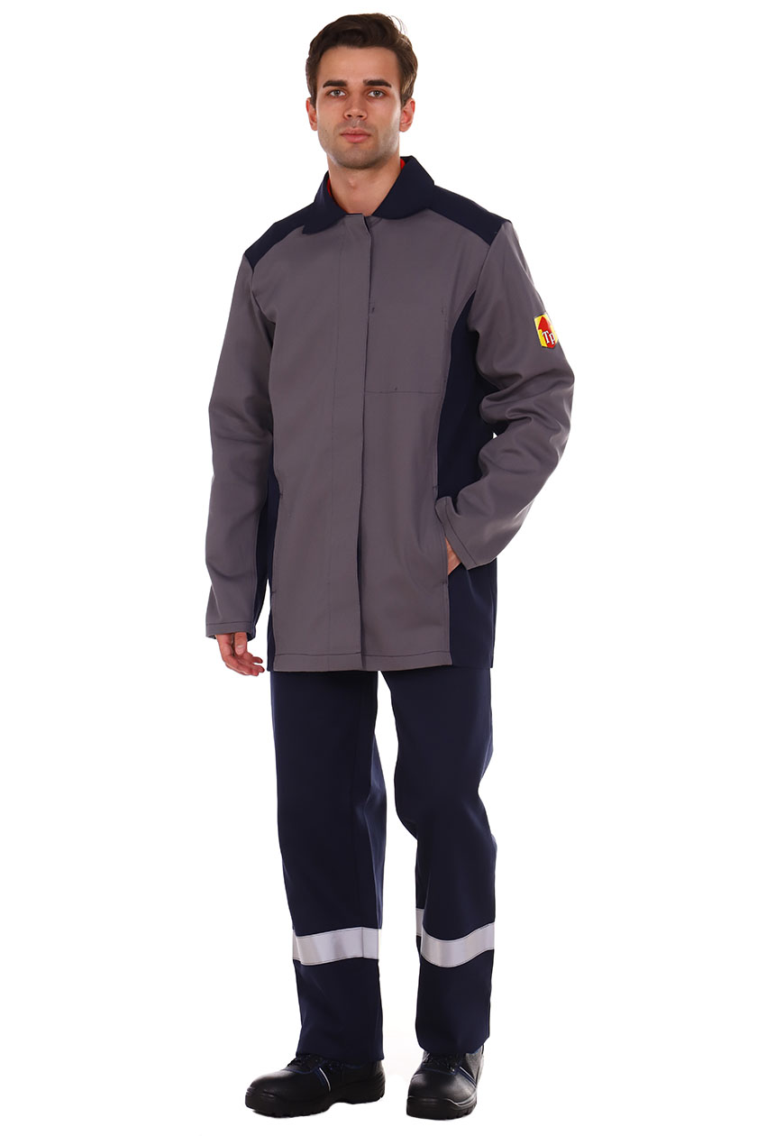 ➠ Куртка прямая с потайной застежкой на пуговицы. Полочки с рельефными швами, с боковыми вертикальными карманами. На левой полочке внутренний накладной карман. Спинка с вентиляционными отверстиями в швах притачивания кокетки. Рукава трехшовные. В верхней части боковых швов, под проймами обработаны вентиляционные отверстия. СОП 50 мм расположен по шву притачивания кокетки к спинке. СОП огнестойкий. Брюки с притачным поясом, застежка гульфика на пуговицы. На правой передней половинке – накладной карман с клапаном.