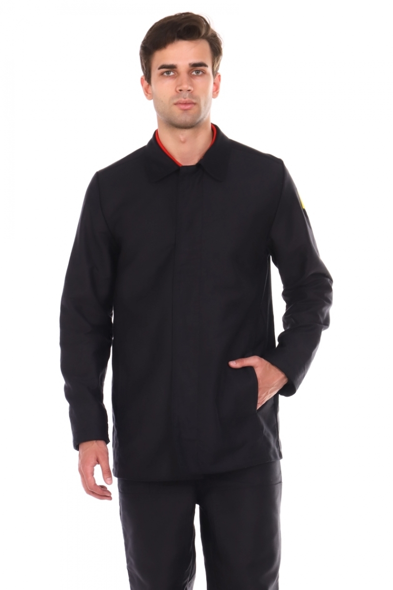 ➠ Куртка с центральной потайной левосторонней застежкой на пуговицы, с притачными рукавами и отложным воротником. Полочки с усилительными накладками по всей длине. В боковом шве накладки вертикальный карман в шве. На изнаночной стороне левой полочки внутренний накладной карман.